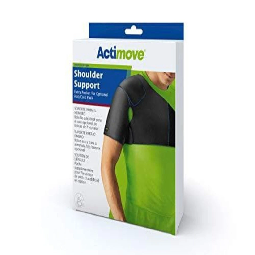 Actimove Shoulder Support with Pocket for Optional Hot/Cold Pack provides adjustable support and protection for shoulder pain and injuries. Actimove Adjustable Shoulder Support supports pain relief and healing through balanced warmth and medical compression. This adjustable shoulder support is designed for comfort and breathability with the COOLMAX AIR performance technology. The built-in pocket provides support for a hot/cold pad.