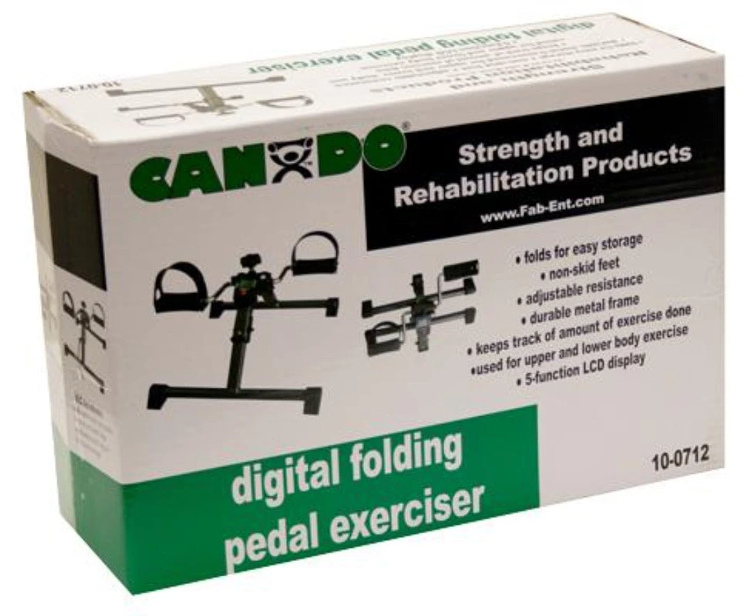 The CanDo Fold-Up Digital Pedal Exerciser ships pre-assembled – just add tension knob! This model folds for easy storage, transportation and shipping. Digital LCD display keeps track of amount of exercise performed, including: RPM, pedal count, time count, calorie count and scan. Requires 3 AAA batteries (included). Pedal exercisers are inexpensive and portable exercisers for both the upper and lower body. They can be used on the floor for foot pedaling, or on the tabletop for hand pedaling. Wide leg spread and non-marring feet keep exerciser stable even when patient has little muscle control. Wrap around adjustable foot straps for use with or without shoes. Adjustable tension knob allows for easy changes in pedaling difficulty level. Pedal forwards or backwards.