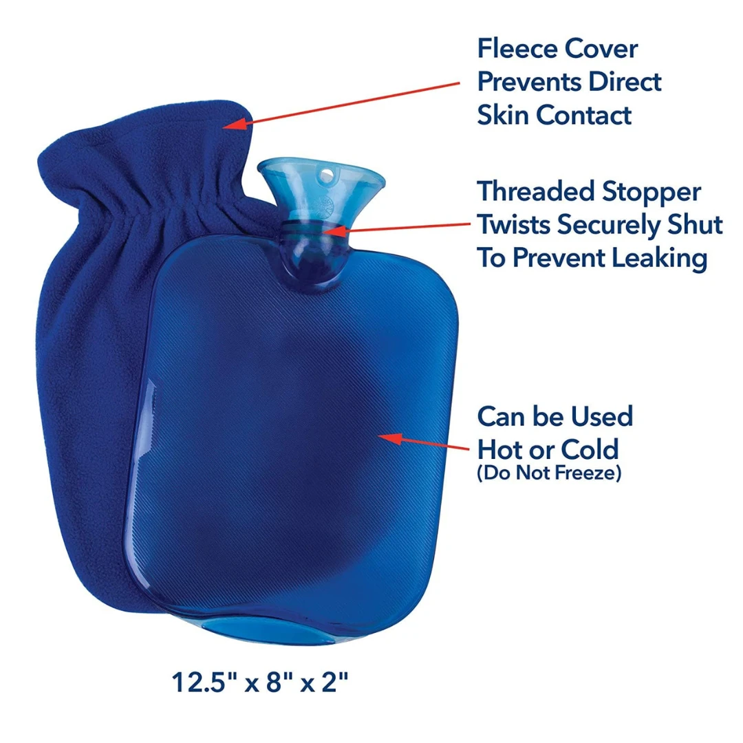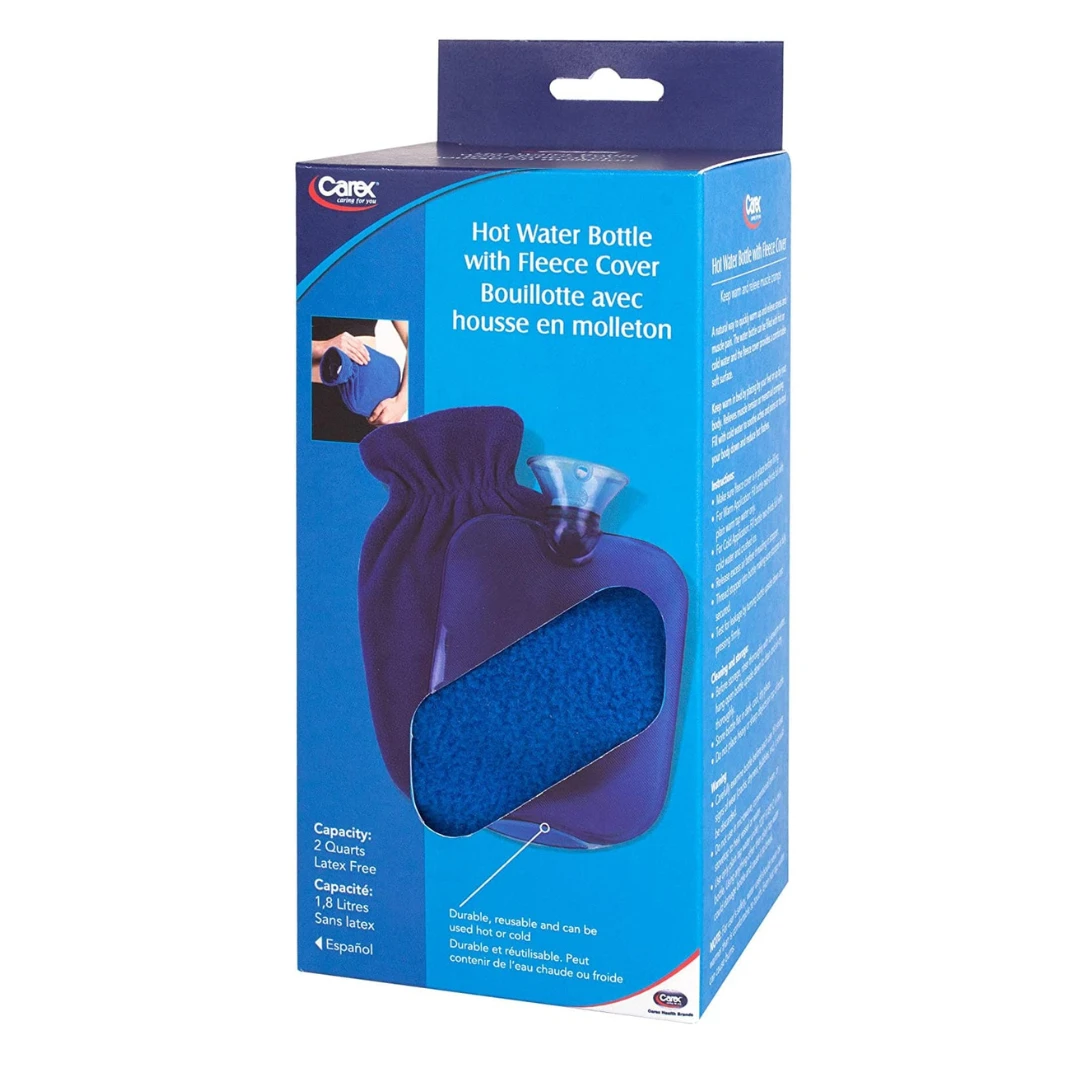 The Carex Hot Water Bottle with Fleece cover is a natural hot pack way to quickly warm up and relieve stress and muscle pain. The water bottle can be filled with hot or cold water and the fleece cover provides a comfortable fuzzy surface. Use the Hot Water Bottle with Fleece cover to keep warm in bed by placing by your feet or up by your body. Relieves muscle tension or menstrual cramping. The water bottle can also be filled with cold water to sooth aches and pains or to cool your body down and reduce hot flashes. Looking for hot water bottles to keep you warm or relieve pain? You found it with the Carex hot water bottle with cover. Cover is made of fleece.