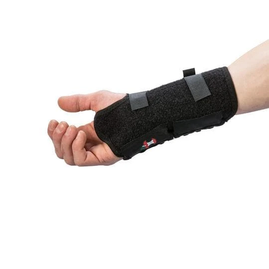 The removable, contoured aluminum palmar stay places the wrist in a cock-up position, allowing the wrist to rest by minimizing motions that may aggravate nerves, tendons, or ligaments. The PowerWrap tabs provide independent adjustments to the wrist and hand regions for customized support and can easily be fine-tuned when more or less support is needed. The low profile form contours to the natural shape of the wrist and hand for increased comfort and support.