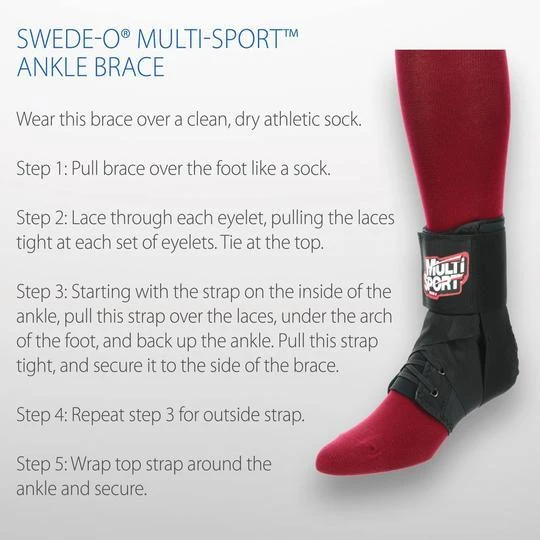 The Swede-O Multi-Sport is a low-profile strap style ankle brace that fits comfortably in most shoes. It utilizes Swede-O’s high quality materials and construction at an economical price. The ballistic nylon brace material is thin, lightweight and durable. Figure-eight straps simulate a professional taping procedure to help prevent ankle injuries. The full top strap secures the figure-eight straps in position for a much more secure fit.