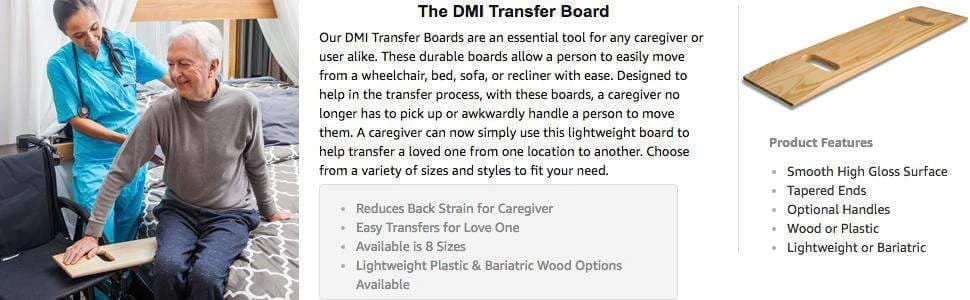Position one end of the board on the starting point and the other end on the destination to which you want to transfer such as the bed, chair, car or wheel chair. The tapered ends should be facing up to help the person slide onto the board. Try to keep the board as level as possible and be sure to lock any wheel chairs in place first. Help the person to get onto the board then assist them as they slide across it in short movements. We highly recommend using the DMI Gait Belt in conjunction with this board to help assist moving the person. Be sure the person is dry to avoid any friction while transferring.