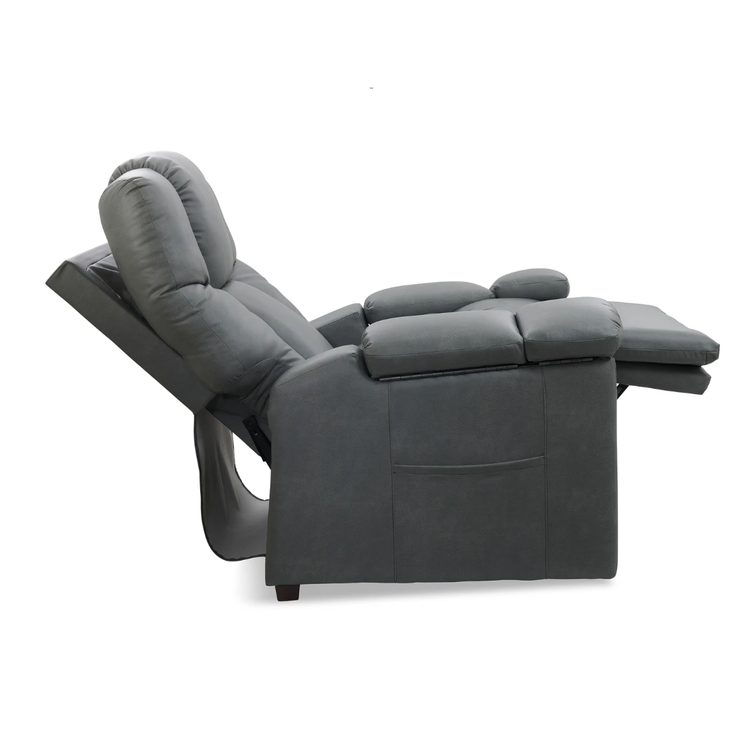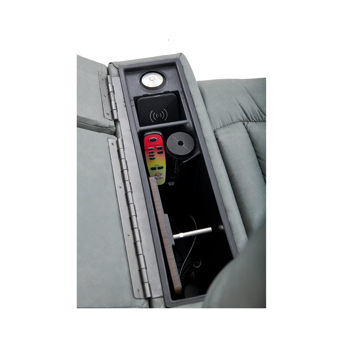 On the left side, the arm compartments unveil an array of exceptional features. Revel in the convenience of a wireless smartphone charger, eliminating the need for bothersome cables while ensuring your device remains powered up. The removable table creates a dedicated space for snacks, books or electronic devices, while an additional USB charging port ensures your devices remain fully charged.