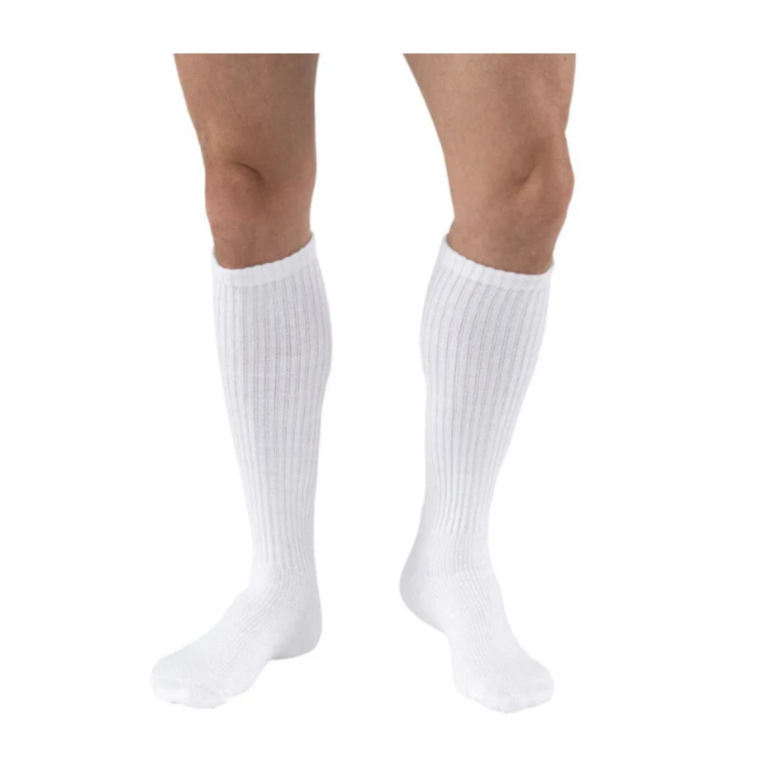 JOBST® SensiFoot Knee High socks are expertly crafted to support the health and comfort of your feet, especially designed with the needs of diabetic individuals in mind. These socks feature a non-irritating toe seam that minimizes pressure and rubbing, reducing the risk of irritation. They also include extra padding in critical areas like the foot, heel, and toe to lessen friction and enhance comfort. Made from multifiber yarns, the socks efficiently wick moisture away to keep your feet dry and comfortable throughout the day.