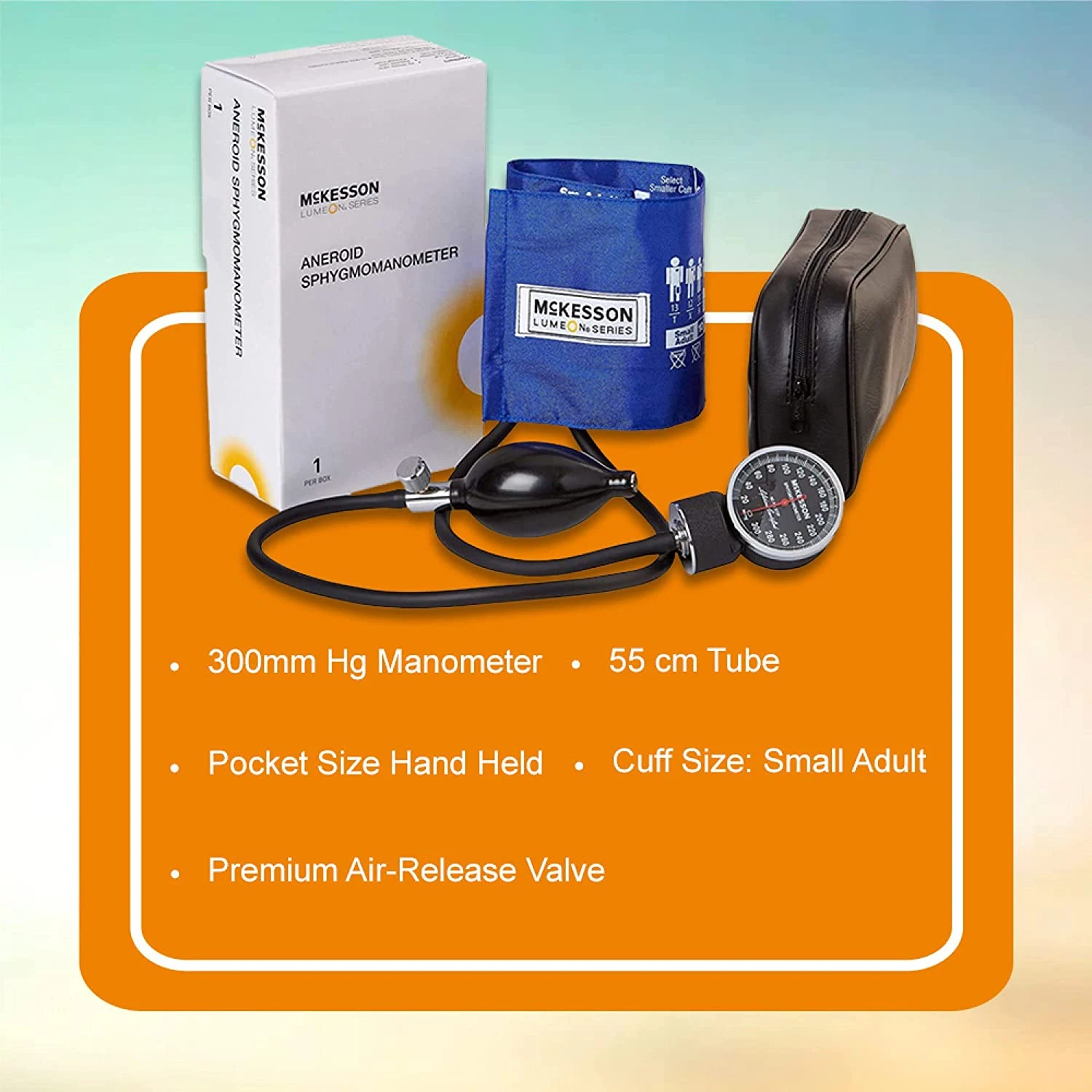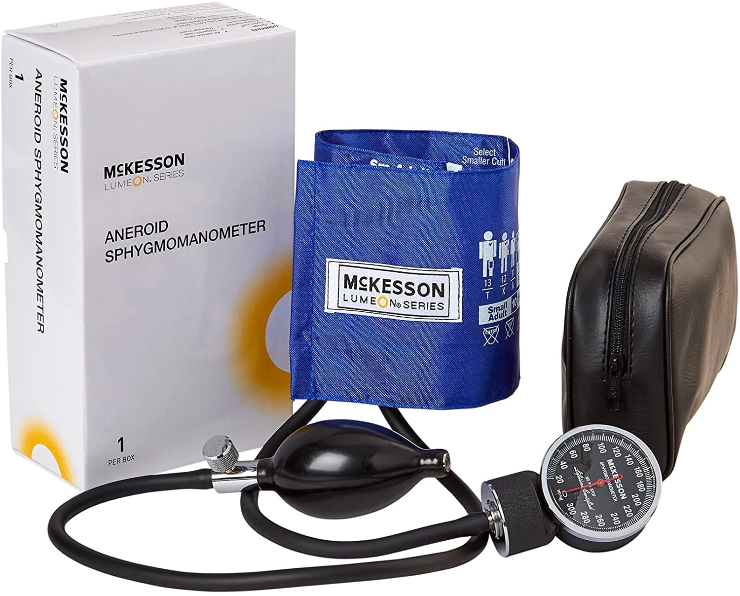 Obtain simple and accurate blood pressure readings at home or in a professional medical environment with the McKesson Arm Aneroid Sphygmomanometer. This pocket aneroid sphygmomanometer includes an aneroid manometer (gauge), complete inflation system (calibrated nylon cuff, latex-free inflation bladder, squeeze bulb and valve), zippered carrying case and operating instructions.