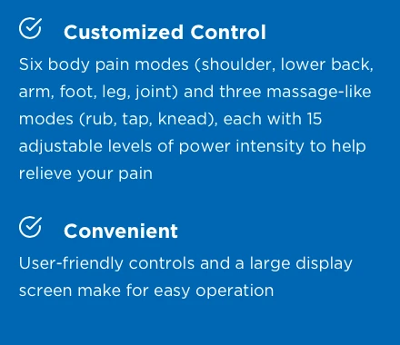 - This device has six body pain modes (shoulder, lower back, arm, foot, leg, joint), and three massage-like modes (rub, tap, knead)