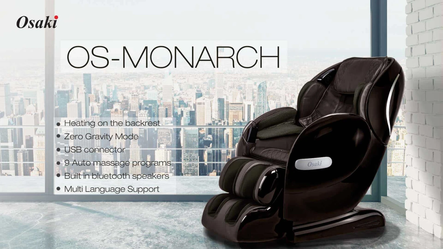 The Osaki OS-Monarch Full Body 3D Massage Chair with 4 Massage Styles & Zero Gravity Recline has a futuristic design with polished hard cover, a comfortable feel, and a 3D roller with a wide range of settings and capabilities. The OS-Monarch can massage you from neck area to glutes and upper hamstrings with L-Track roller. OS-Monarch has 4 massage style (Kneading, Knocking, Tapping, and Shiatsu) that makes you completely relaxed. With the Osaki OS-Monarch, you can sit down, choose a language you want, variety of auto and manual massage setting, get comfortable, and relax. The Osaki OS-Monarch is equipped with Bluetooth technology that allows the user to listen to their favorite music and phone calls on high quality speakers in the headrest.