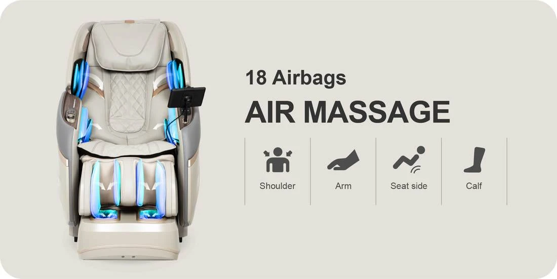 There are multiple airbags located throughout the massage chair to offer a full body massage experience. The Emperor offers a total of 18 highly advanced airbags in the massage chair. Airbags are located at the shoulders, arms, waist and pelvis, and the calf areas. The total air bags have been reduced but covers more surface area than previous technology with far greater efficiency and reliability.