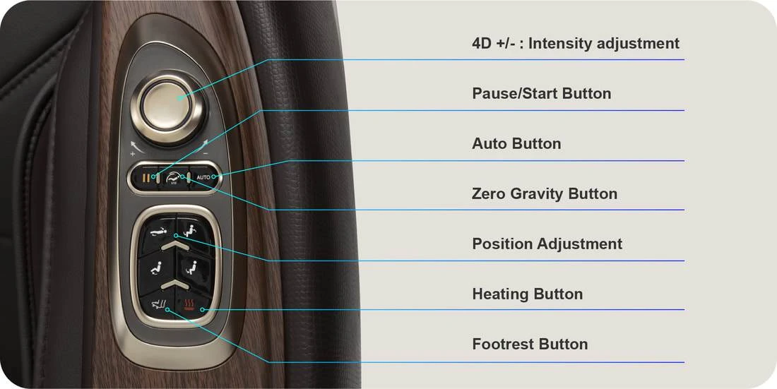 Side panel controller is designed that the user can easily control the chair without using a remote tablet. The user can adjusting 4D intensity, reclining positions, Zero Gravity, Auto massage program and Heating function.