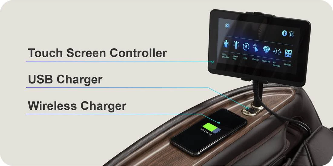 The Osaki OS-Pro 4D Emperor’s remote is upgraded to Touch Screen Remote Tablet. It has an easy view screen displaying the function of the chair. It also has magnetic holder that holds the remote into place. The interface is very easy to navigate and adjust settings.USB Charger & Wireless Charger