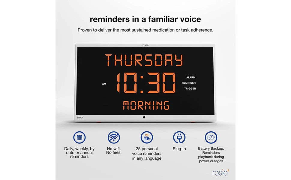 Reminder Rosie is a 100% Hands Free Digital Alarm Clock Memory Aid with Revolutionary Speech Recognition; Records & Announces Multiple Loud Personalized Voice Alarms at a Specific Time and Date; Everyday, Weekly, Monthly & Annually. A Simple Solution to Remember Meds, Appointments, Household & Personal Tasks, Birthdays & Much More… We have been searching for a talking clock for dementia patients who are experiencing sight and memory problems and have found this memory aid with an Large LED clock display. Caregiver’s lives can be a lot less stressful with this easy to use reminder clock known as ‘Reminder Rosie’ The caregiver at home or at a facility can record a reminder. An example could be “I love you Dad, it’s time to take 1 blue pill and 2 yellow pills” and this is set for 8 am daily. The reminder can be turned off by touching the clock or by saying “reminder off”. The reminder keeps being repeated intermittently for up to 30 minutes. Rosie can also announce loud (you control the volume) personal messages preset to go off when you want: daily, weekly or at a certain date during the year. This is done in your own voice so it can be in any language. This is truly a talking reminder clock!