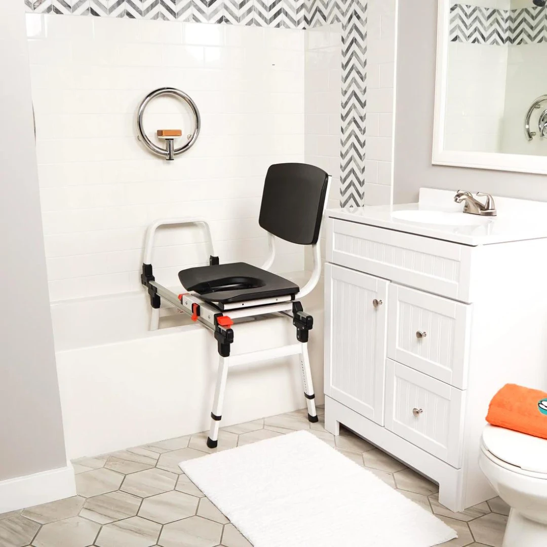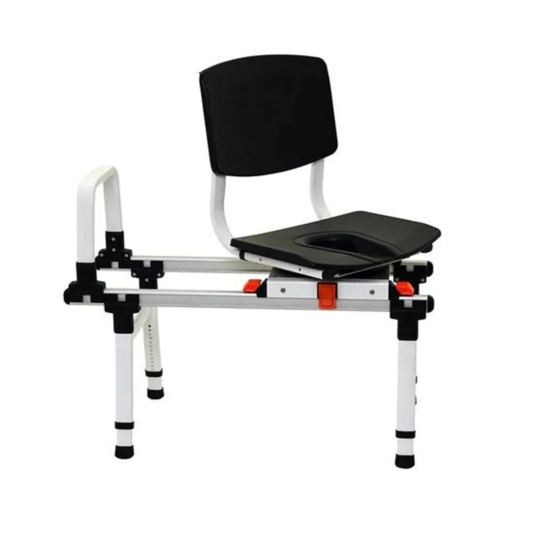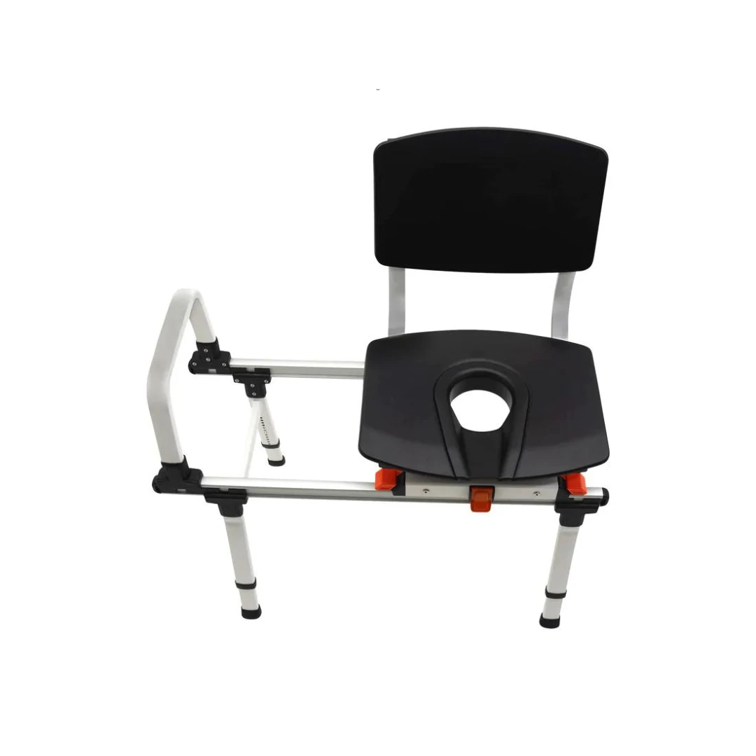 ShowerGlyde Model SG3 is a sliding transfer bench designed to fit in tighter environments or bathrooms with a vanity adjacent to the tub. Shorter rails and a swivel option allow the chair to clear the obstruction/tight space without sacrificing comfort or ease of use. SG3 slides easily in and out of the tub and locks in two points; on the inside and outside of the tub. SG3 can be assembled as a left or right-hand unit. One grab bar installed at the wall-side of the rails is included for support in sliding.