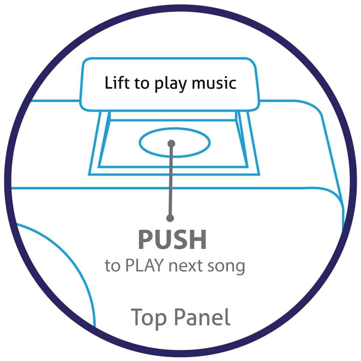 - 3Â controls: lift the lid to start the music playing, push the big button for the next song, and close the lid to stop the music.