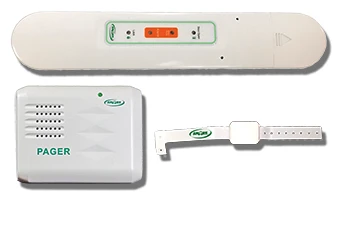 - Monitor sends quiet wireless signal to pager for noise-free caregiver notification.