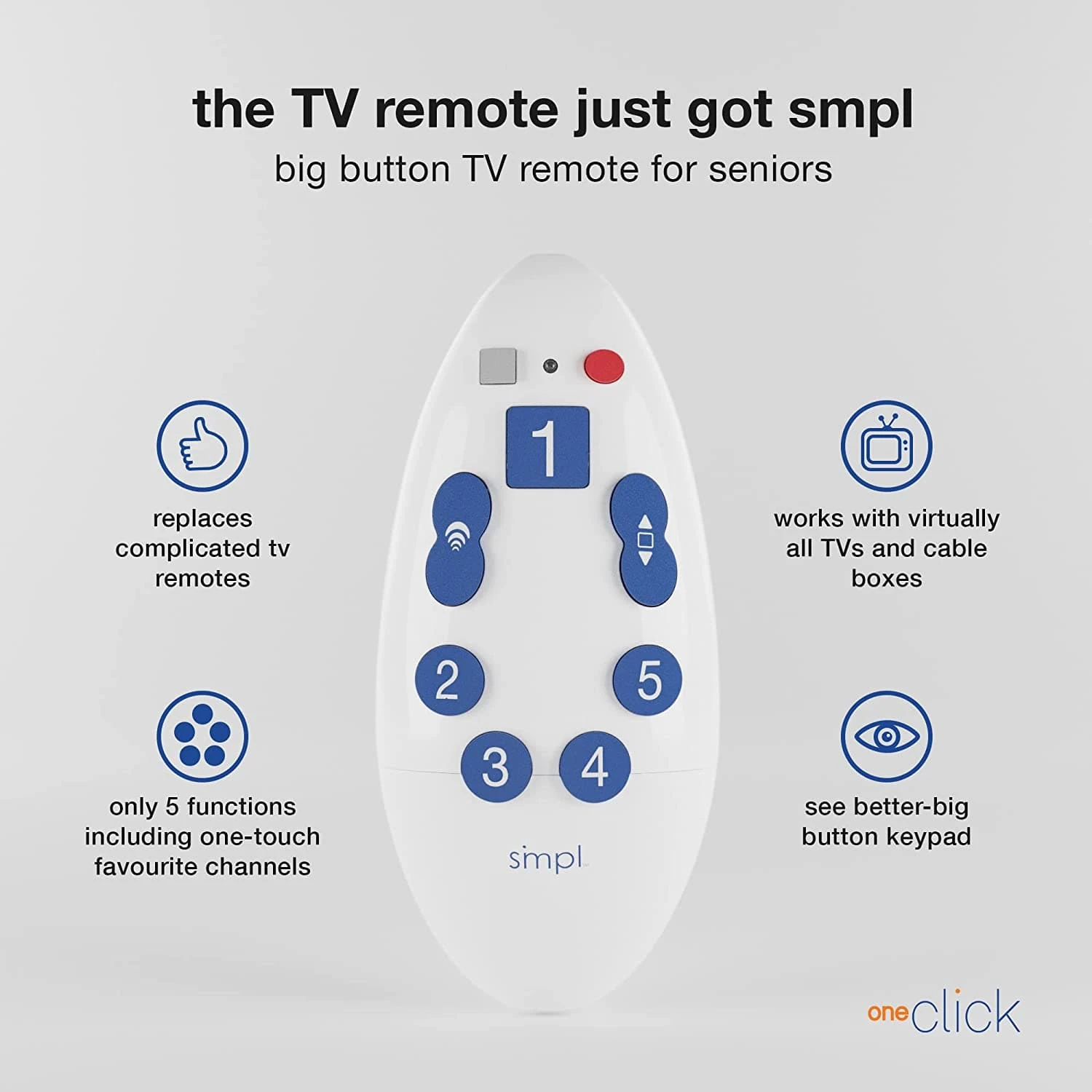 Now they’re in control of their TV, so you don’t have to be. At last, an easy-to-use, big button universal TV remote for seniors, children, partially-sighted users and work settings such as waiting-room TV’s. A single press turns on/off the TV and set-top box. Go to one of their 5 favorite channels directly with one smpl press. Eliminate the confusion from multiple TV remotes and so many buttons. Promotes independent living, self-esteem and elder dignity.