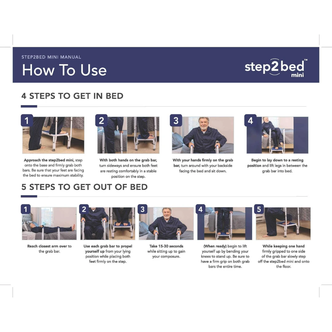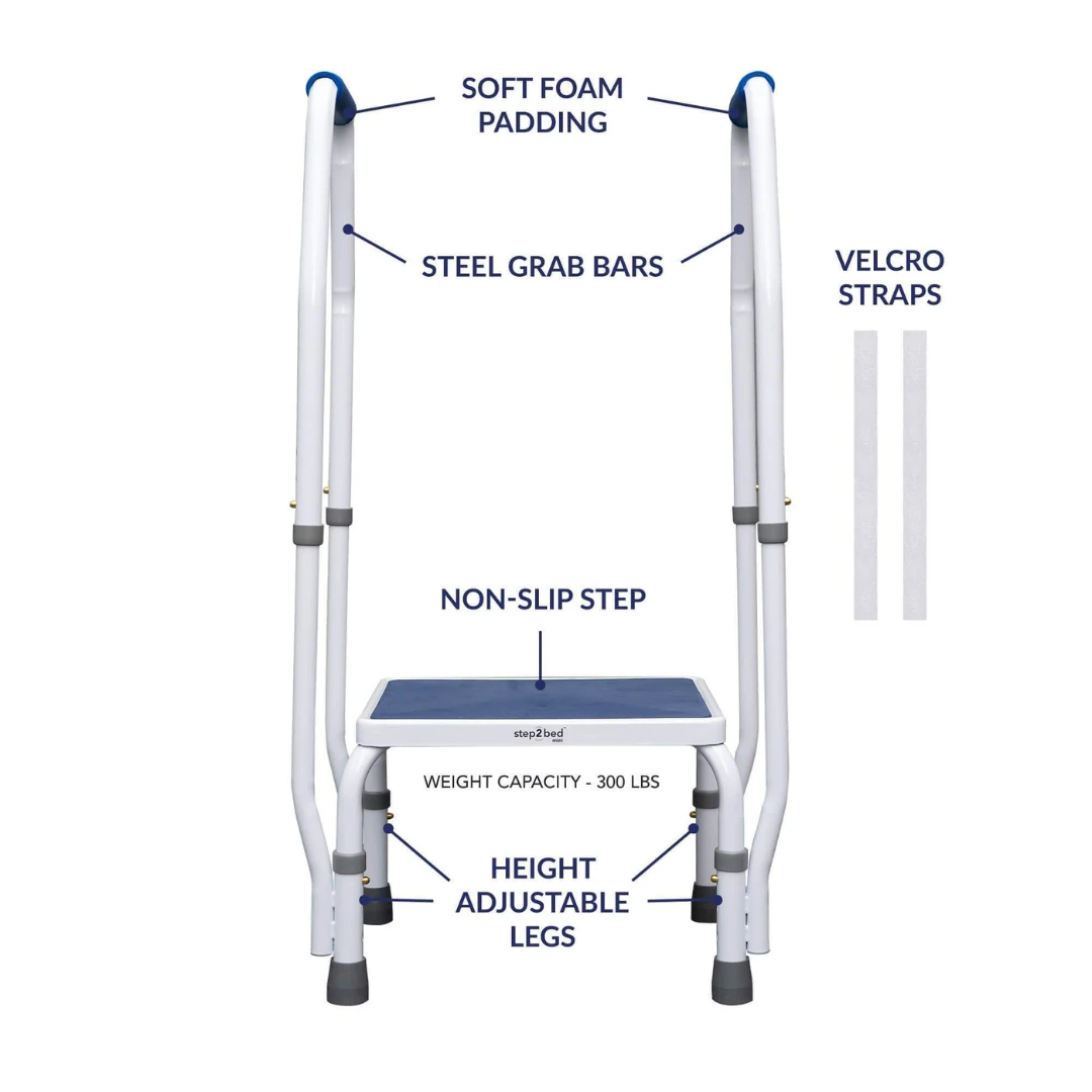 The step2bed mini is safest way to get into and out of bed. The Safety Of Dual-Padded Grab Bars, The Utility Of A Non-Slip Step Weighing Only 13 lbs, The step2bed mini Supports Up To 300 lbs. Great For Anyone With A Knee Or Hip Injury/Pain. Height Adjustments From 8″ – 10.” The step2bed mini is made of durable steel.