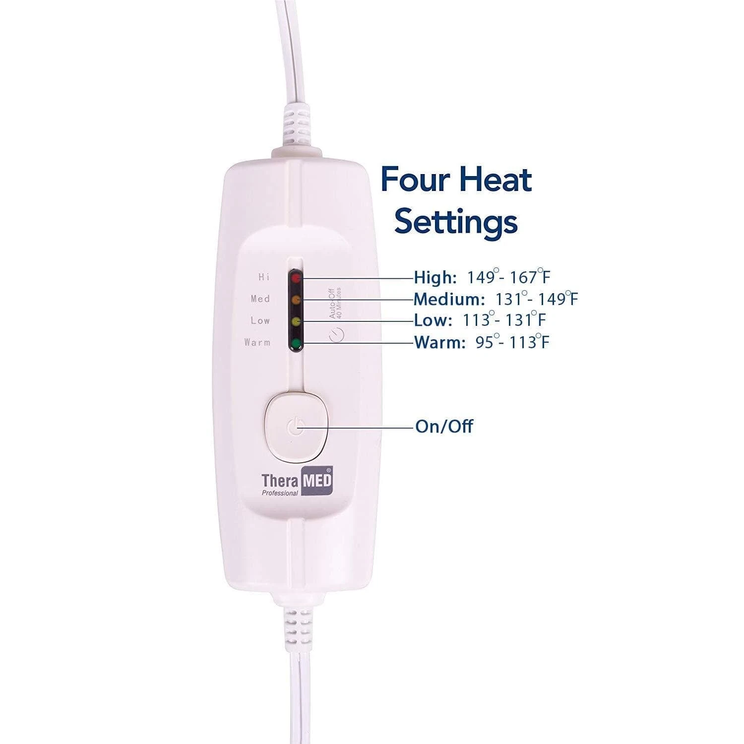 Its four heat settings allow you to control your own therapy with a simple press of a button. The moist heat option provides deep penetrating relief from sore, stiff muscles, while the dry option provides a comforting warm treatment. The unique pad design delivers a consistent therapeutic heat in the recommended range and eliminates any spikes to maintain an even comfortable level at all times. For added safety, the auto shut-off feature turns the pad off after 40 minutes of use. The removable ultra-soft cover is machine washable.