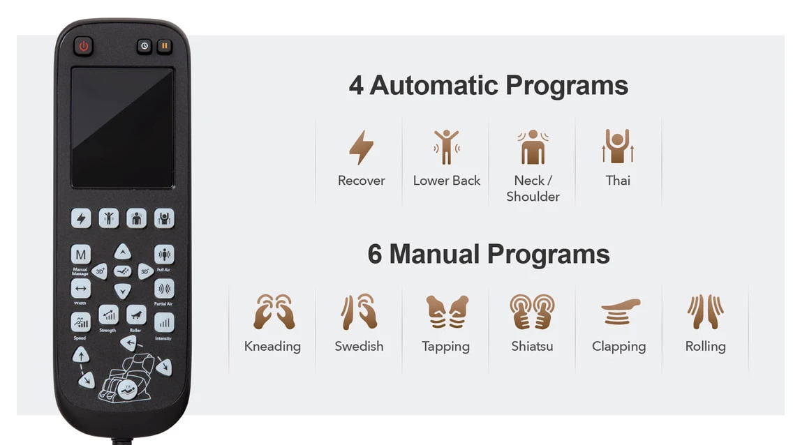 The Titan Optimus 3D comes standard with Titan’s latest massage rolling track, which massages from your neck, all the way down to your glutes and upper hamstrings. This is called an “SL” rolling track, and it works with the computer body scan at the beginning of every session to give every user a massage that fits their body.