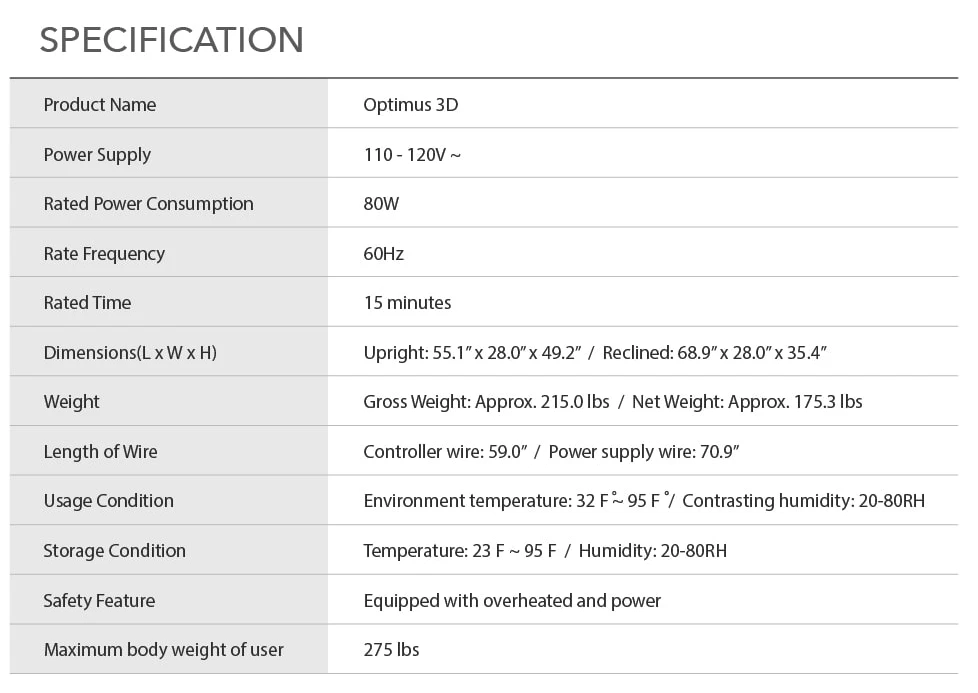 The Optimus 3D was designed with efficiency in mind, and that includes the entire airbag system in the chair. The stream-lined design uses less airbags, while still giving a full-body air compression massage. This also increases the longevity and reliability of the chair. There are 36 airbags located throughout the massage chair to offer a full body massage experience. With the 36 airbags it covers more body surface than its previous generations while applying a more consistent pressure throughout the chair.