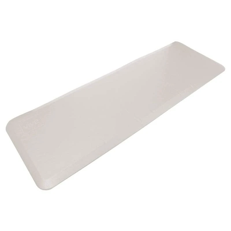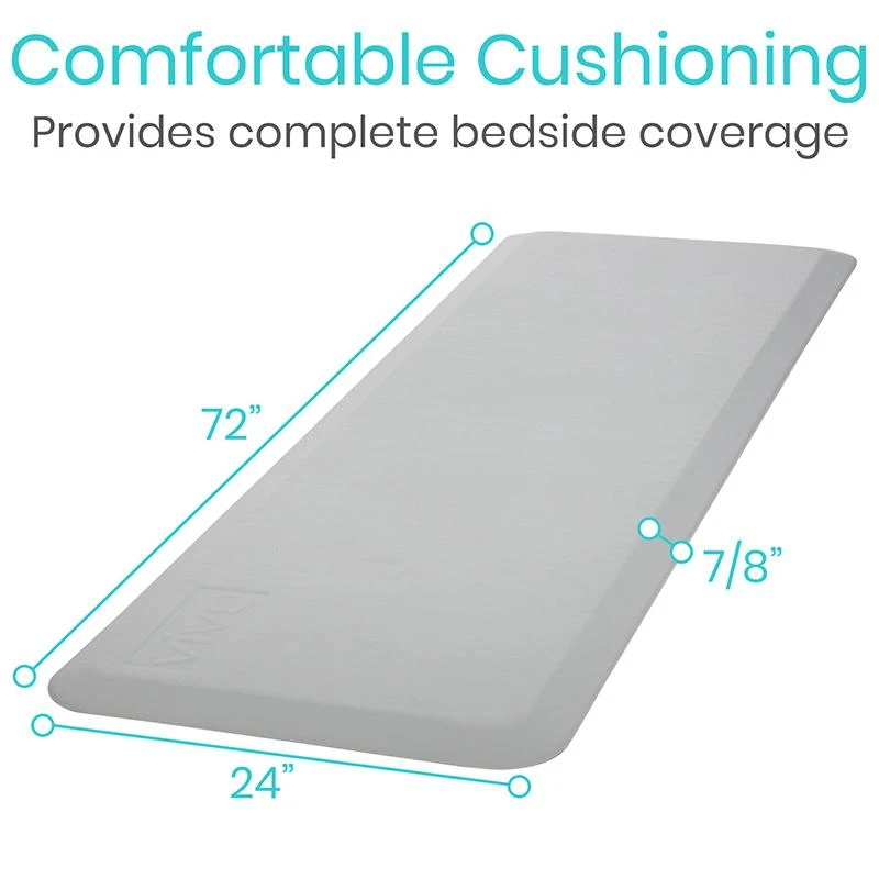 Minimizing tripping hazards, the bedside fall mat has low-profile, beveled edges to also provide easy access for wheelchairs and other mobility aids. A durable, slip-resistant rubber backing prevents the mat from sliding on any floor surface, including wood, tile or carpet. The soft foam mat has a non-slip, textured cover to provide safe and comfortable footing around the bed.