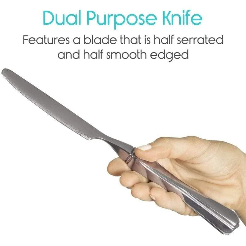 Providing greater independence at mealtimes, the four-piece weighted tableware set reduces tremors due to Parkinson’s disease, ataxia, essential tremors and weakened grip strength. Restoring dignity and normalcy, the polished stainless steel utensils are styled to be inconspicuous for confident use at home and on the go. Designed for optimal functionality, the set includes a serrated table knife, a standard fork, tablespoon and soup spoon, the adaptive, weighted utensil set reduces spills, splashes and drops at every meal. The soup spoon also features a deep bowl to prevent spills and mishaps.