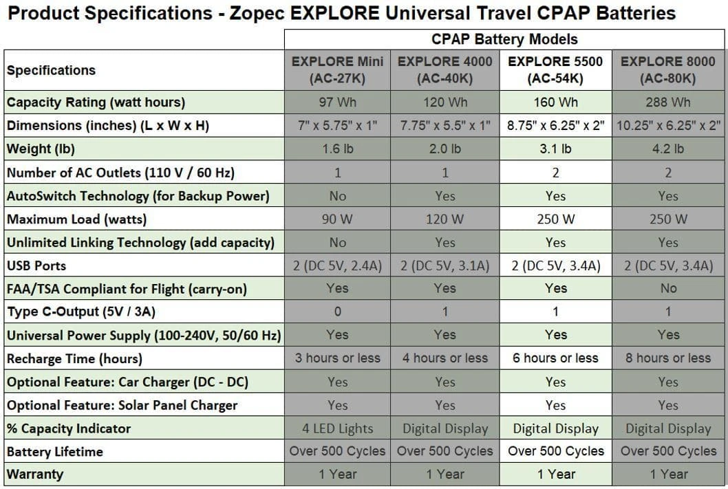 This Zopec EXPLORE 5500 Travel Battery is FAA/TSA Compliant for Carry On luggage. Also, you can bring 2 of them on the plane. Car Charger and Solar Charger available for separate purchase. Zopec EXPLORE has 4 models of CPAP batteries with different capacities. Please search Zopec EXPLORE and you can find the right size just for your need. You don’t have to pay more or get a larger size battery than what you are looking for. See www.ZopecExplore.com for more product information
